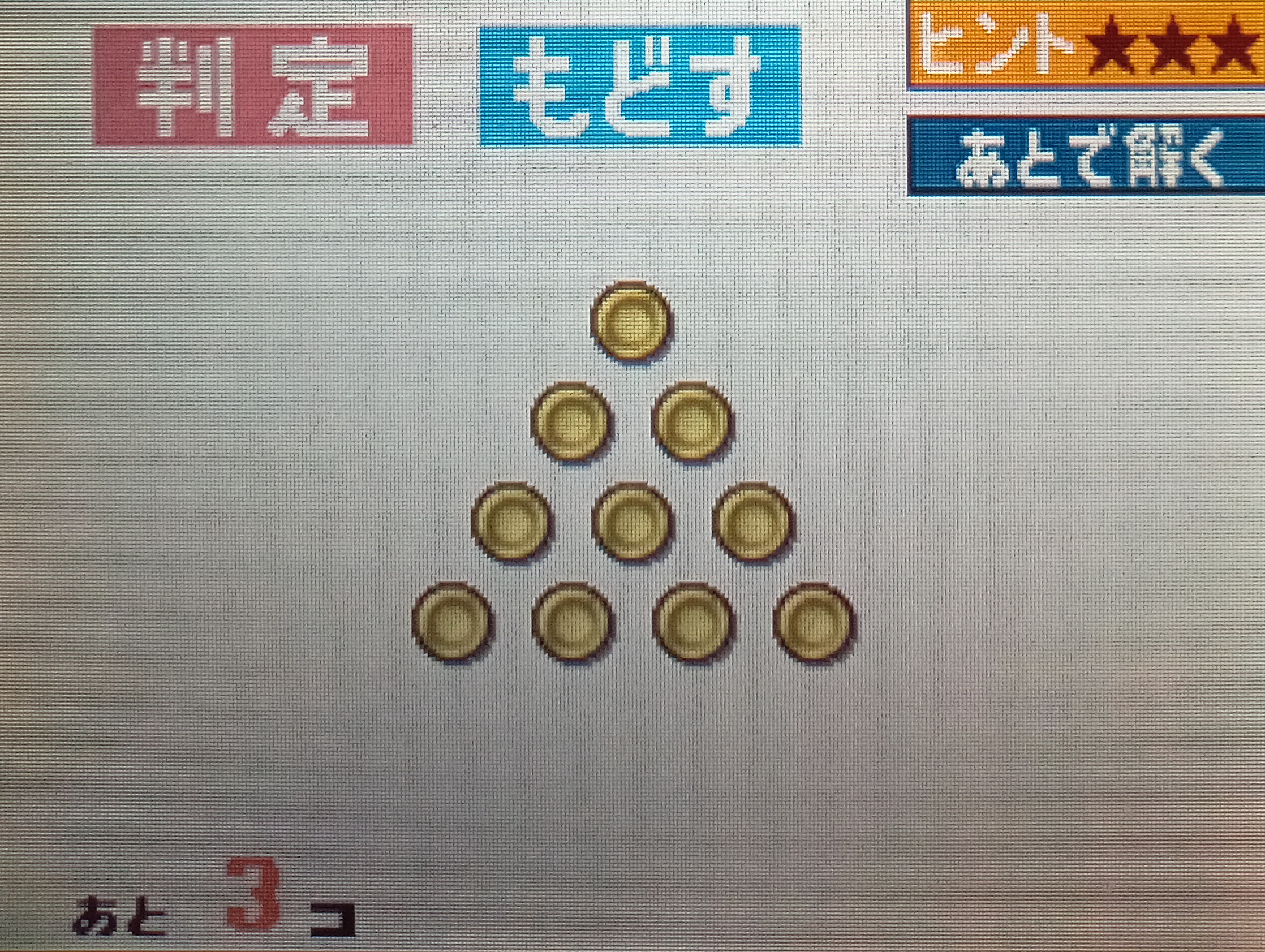 このうち3個のコインだけを動かして、三角形の向きを反対にしてほしい。