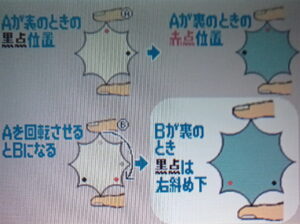 この盤をBの左図のように持ちかえて、同様に裏を返すと、黒丸は