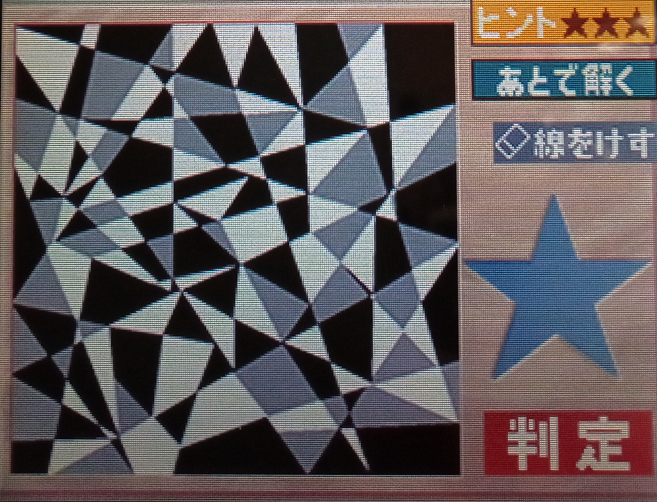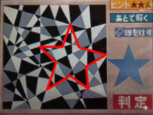 | 最終判断 | 星は 画面のやや左寄り・中央付近に、三角形の集合として完全な五芒星の形で隠されています。 | 星は、中央より少し右下のあたりにあります。 | 中央の幾何学模様の中に、右側の青い星とまったく同じ形・大きさの星が巧妙に紛れ込んでいました。 |