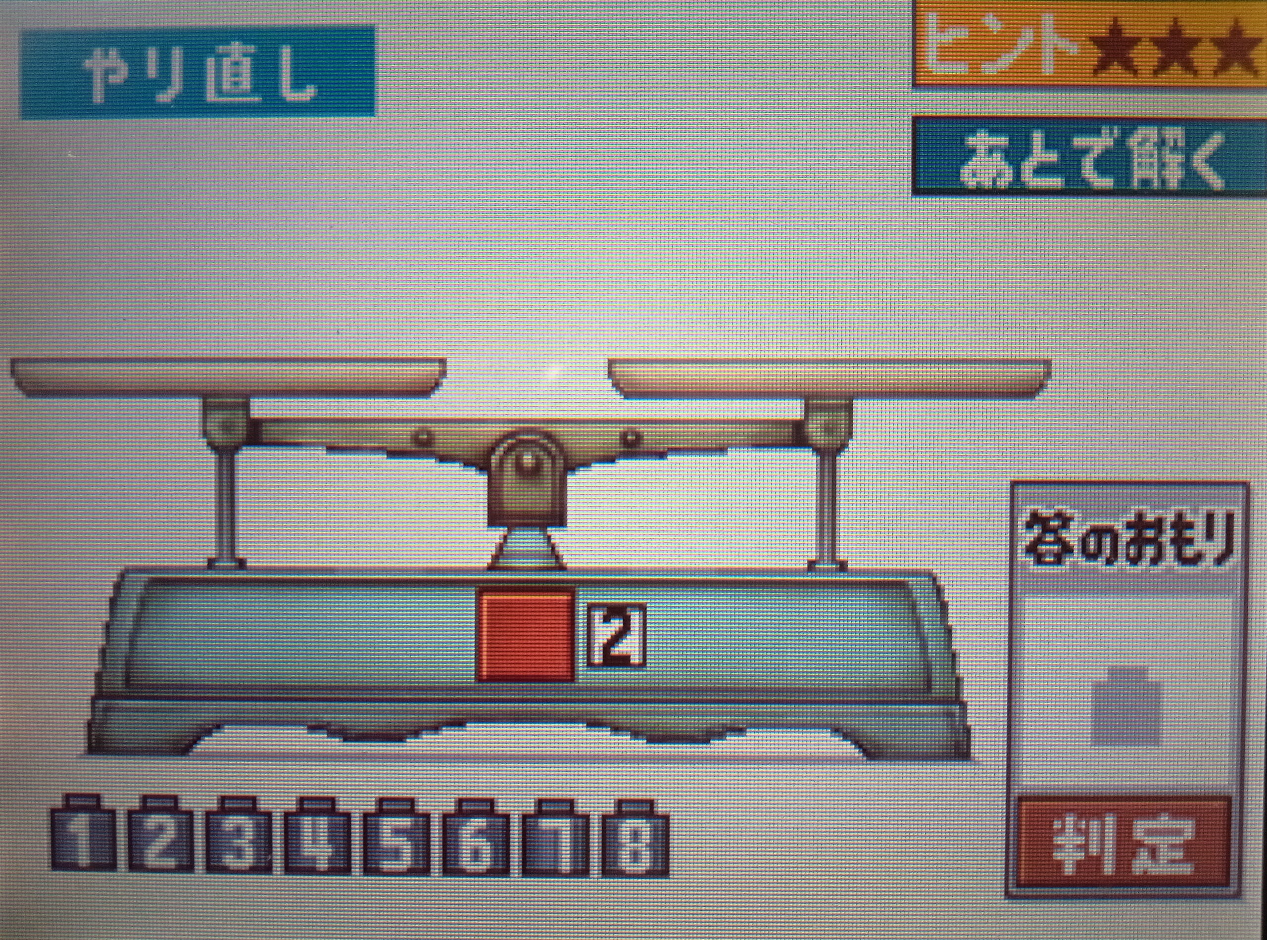 この問題の肝は当然、最初に3グループ(3個、3個,2個)に分けて測れるかどうか。