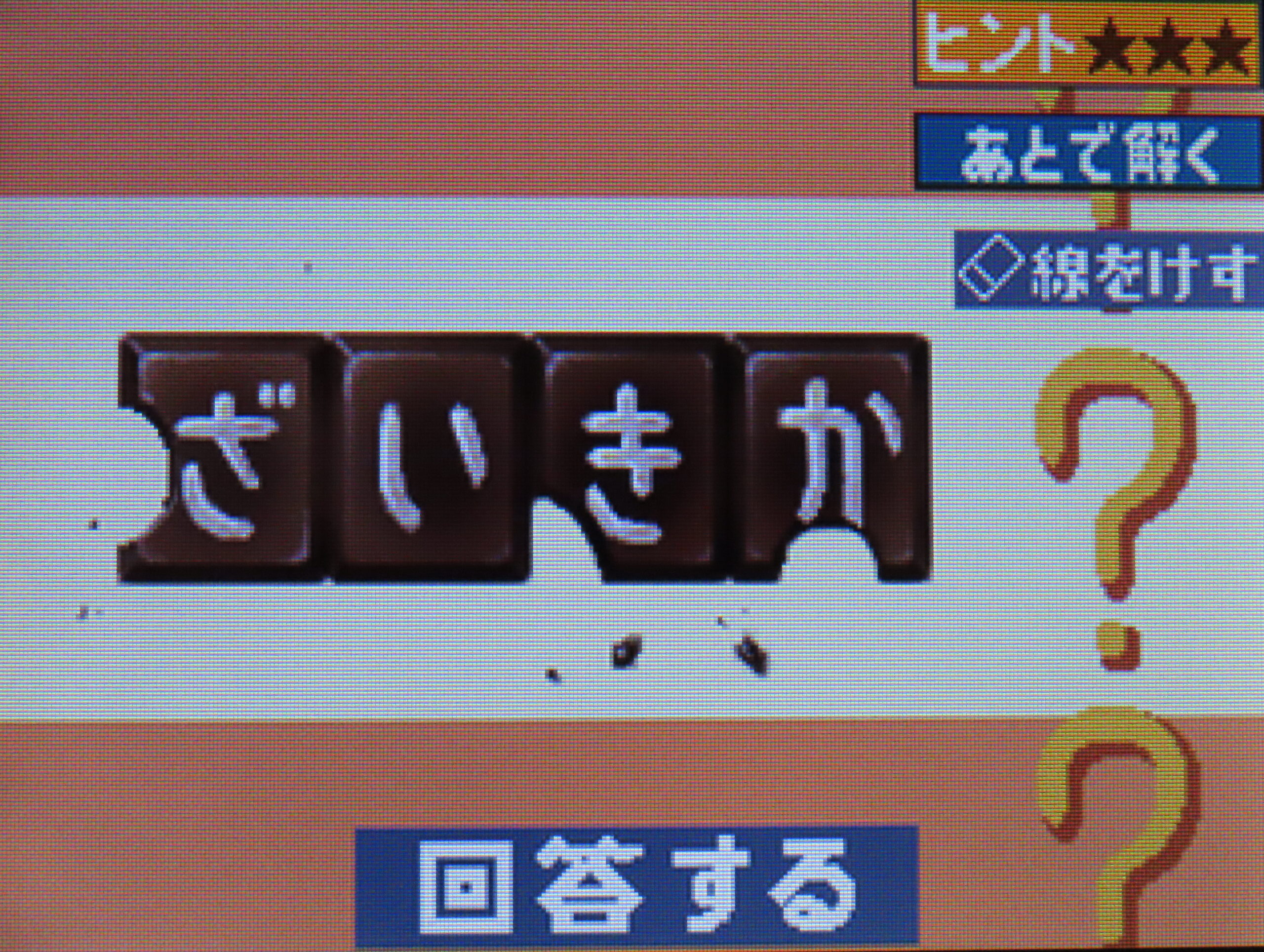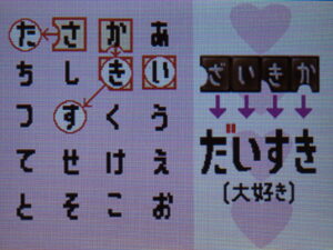 | 最終判断 | つまり並びは だ・い・す・き | 彼女がにっこり笑って伝えたかった、ひらがな4文字の正解は… 「だいすき」 | これは「だいすき」というメッセージだと思っていいやつですね。 |