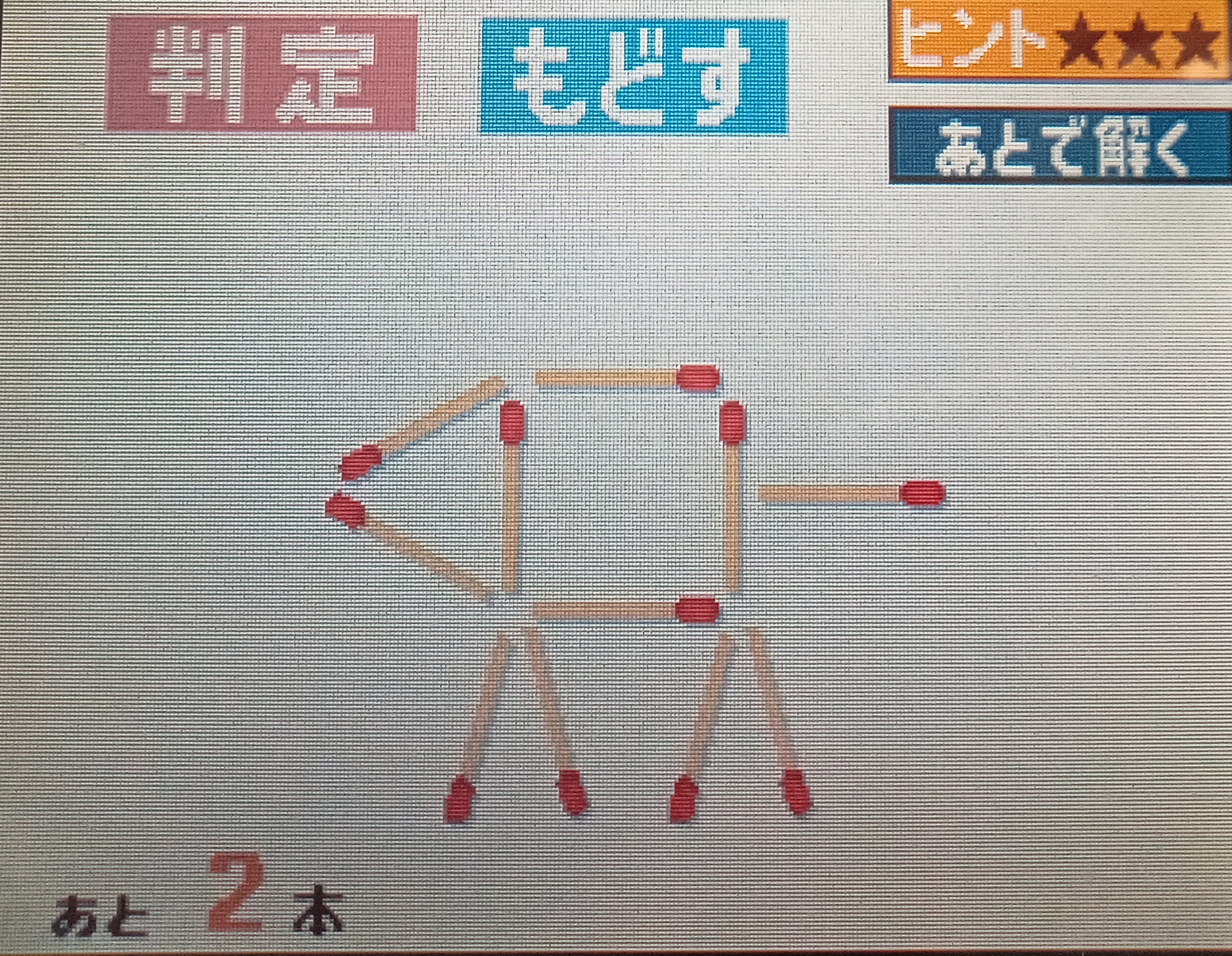 左から3本目の足として使われているマッチ棒→胴体の四角形の右上の角に、斜め上(右上)を向くように配置します。