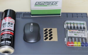 マウス本体の右の黒いのは替えソール達です。前回対処した分1列が無くなっていますw