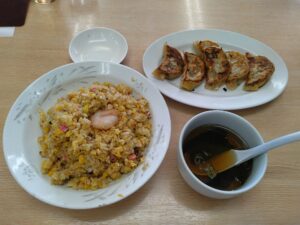 ちょっと奥まった所に入った所にある中華料理店で五目チャーハン+餃子