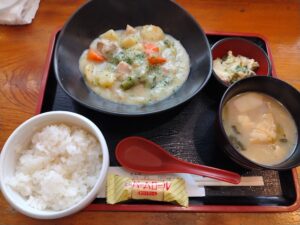 シチュー(うまい)、小鉢(うまい)、味噌汁(うまい)、ごはん(うまい)
